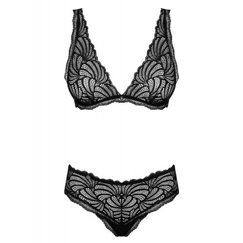Αισθησιακό σουτιέν και στρίνγκ από δελικάτη δαντέλα σε βαθύ, κλασσικό μαύρο χρώμα έτοιμη να καθηλώσει. Με μοναδικό μοτίβο από δαντέλα το οποίο αγκαλιάζει το σώμα και αναδυκνύει τις υπάρχουσες καμπύλες σας, αυτό το σετάκι θα αφήσει το ταίρι σας άφωνο!