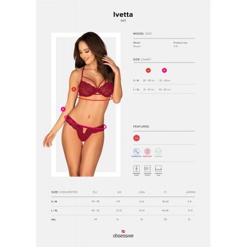 Απόψε θα παρουσιάσετε τον εαυτό σας με ένα εντελώς αισθησιακό στυλ! Θα εκπλήξετε τον άντρα σας με φαινομενικά κλασικά εσώρουχα ... Η Ivetta από ελαστική δαντέλα θα τονίσει τα στήθη σας καθώς και τους γοφούς σας. Ξέρετε ότι έχουμε πάντα αυτό που χρειάζεστε!