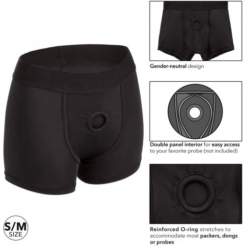 Εσώρουχο strap-on της εταιρείας Calexotics σε μαύρο χρώμα και σχεδιασμού μποξεράκι, το οποίο είναι κατάλληλο τόσο για γυναίκες όσο και για άνδρες και σχεδιασμένο ώστε να παρέχει ευκολία και μεγαλύτερη άνεση στην εφαρμογή. Διαθέτει υποδοχή για βάση ντίλντο ομοίωμα πέους, ενώ παράλληλα διατηρεί την ελευθερία στον έλεγχο των κινήσεων. Οι ιμάντες υποστήριξης καλτσών αποτελούν ρυθμιζόμενοι, ενώ το μαλακό υλικό καθιστά την χρήση άνετη.