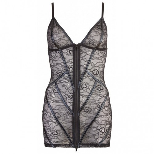 Προκλητικά σαγυνευτικό σέξι ημιδιαφανές δαντελένιο μίνι φορεματάκι με φερμουάρ στο μπροστινό μερος. Διαθέτει ρυθμιζόμενους γυαλιστερούς ιμάντες για ακόμη πιο τελεια εφαρμογή στο σωμα - για να τονιζει της καμπίλες οσο καλύτερα γίνεται.