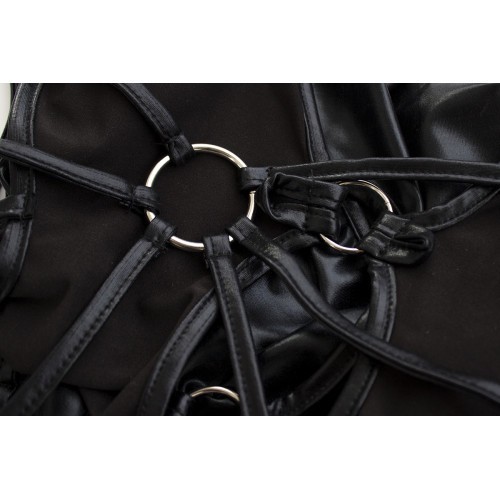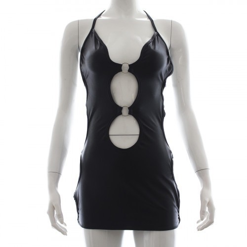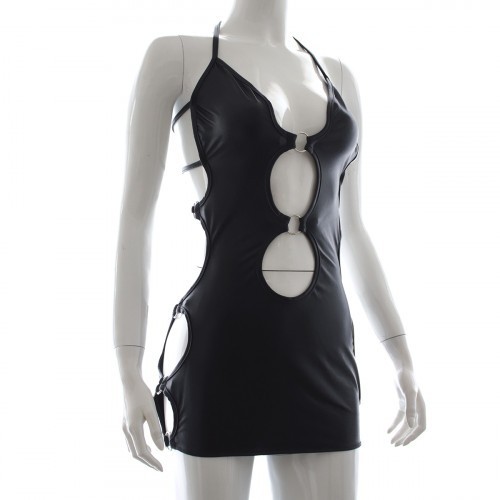 Ντύσου για να εντυπωσιάσεις με αυτό το μίνι φόρεμα, το οποίο είναι εμπνευσμένο από τον κόσμο του bdsm και διαθέτει συμμετρικά ανοίγματα στα πλευρά, τα οποία οδηγούν σε μια σέξυ μισάνοιχτη πλάτη. Διαθέτει επίσης δυο ανοίγματα μπροστά, τα οποία είναι διακοσμημένα με 2 ασημένια δαχτυλίδια.
