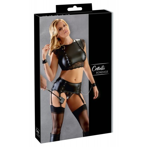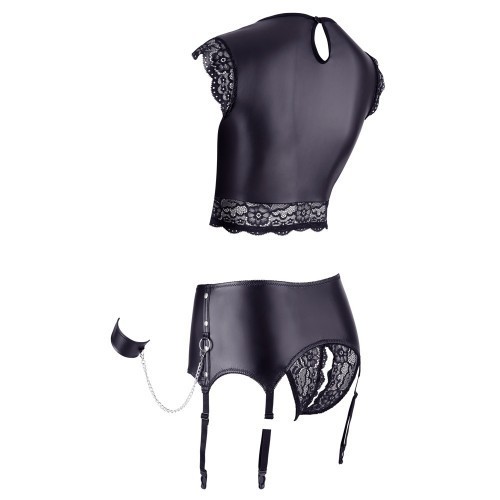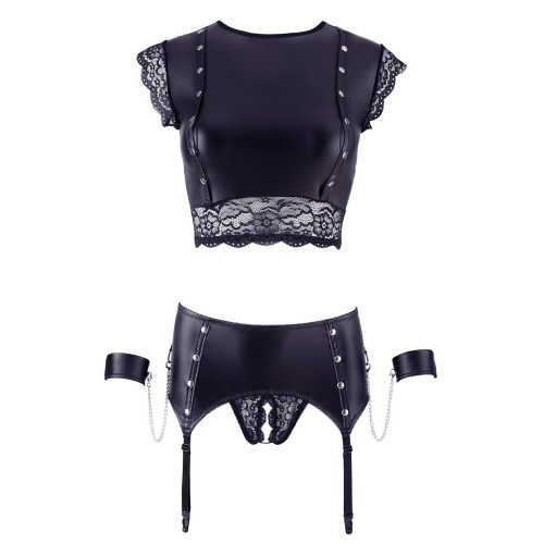 Κάνε κάθε φετιχιστικό σου όνειρο πραγματικότητα φορώντας αυτό το ποιοτικό, φετιχιστικό σετ εσωρούχων. Αποτελούμενο από στενή σε εφαρμογή, κοντή μπλούζα, στρινγκάκι με ανοιχτό κάβαλο και ζώνη καλτσοδέτα. Το υλικό κατασκευής αποτελεί ελαστικό και ματτέ σε υφή, καθιστώντας το ιδανικό για να αναδείξετε το σώμα σας. Είναι διακοσμημένο από δελικάτη δαντέλα, η οποία κάνει την εμφάνιση σας ακόμη πιο κομψή κατά την διάρκεια των ερωτικών παιχνιδιών. Η ζώνη υποστήριξης καλτσών, διαθέτει ατσάλινα δαχτυλίδια τα οποία μπορούν να υποστηρίξουν τις συμπεριλαμβανόμενες χειροπέδες για ακόμα πιο πολλή διασκέδαση!