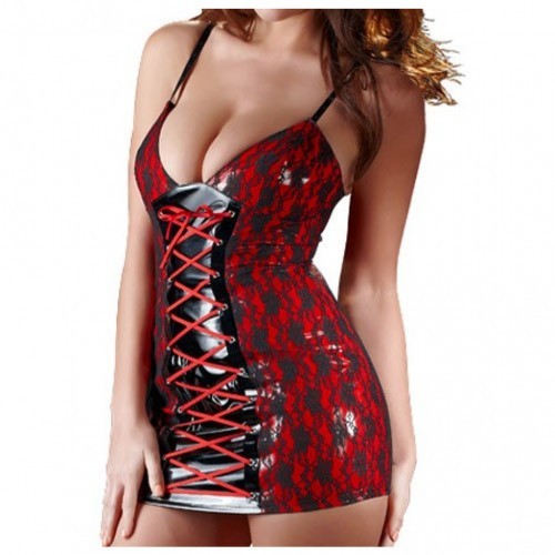 Tight fitting red vinyl mini dress with black lace cover and black vinyl inserts at the back and the front. The dress has zip at the back.