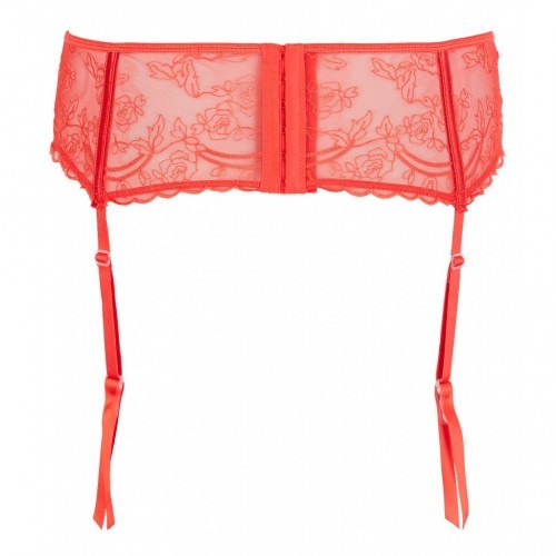 Suspender belt with four adjustable straps and a hook-and-eye closure. Delicately embroidered red transparency.