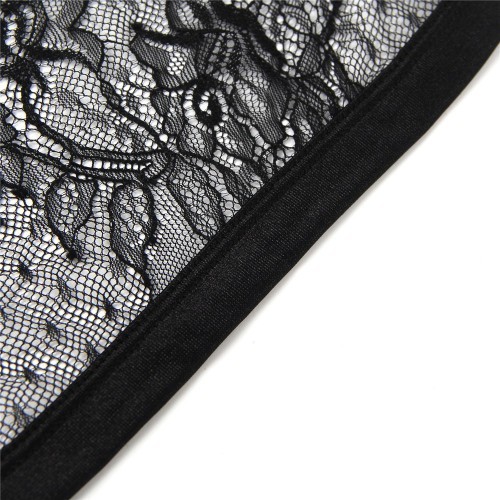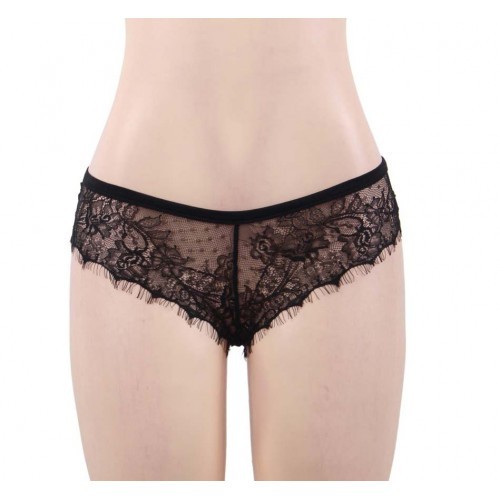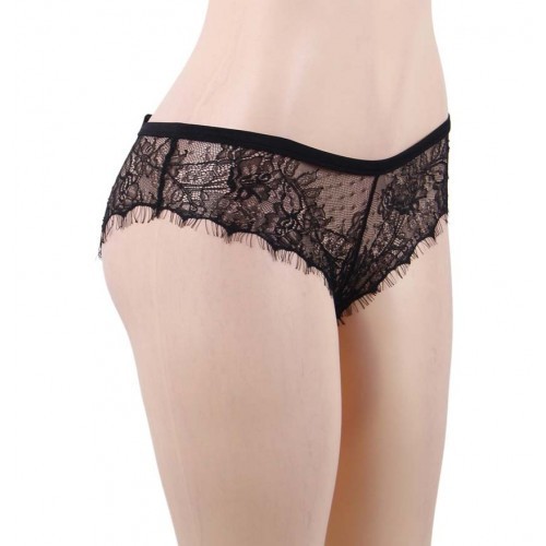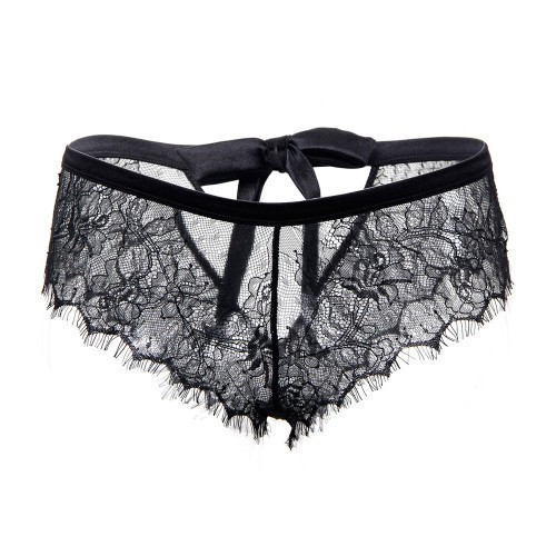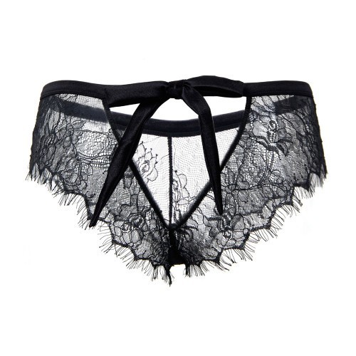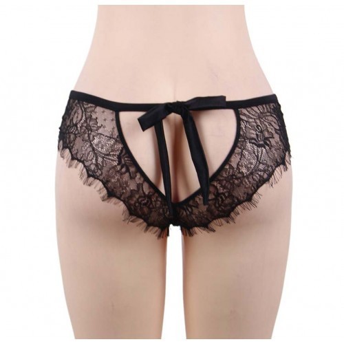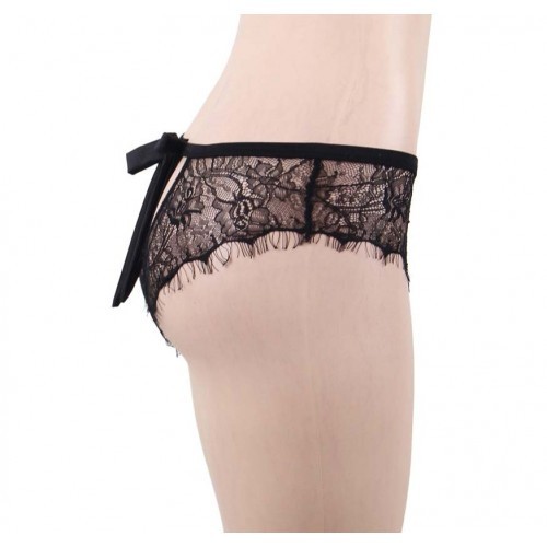 Black floral lace knickers with provocative cutout at the back for ladies who know what they want from their life. The sexy underwear will sit low on your hips following the natural curve of your bottom. The back is decorated with large black bow.