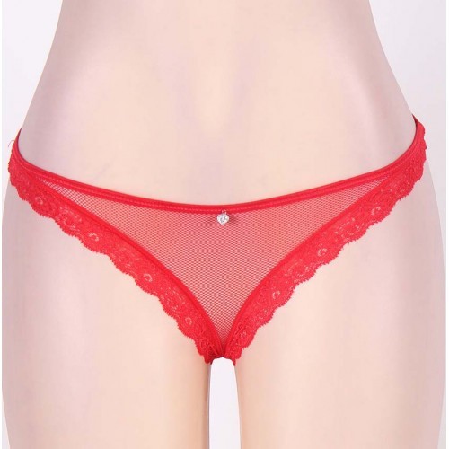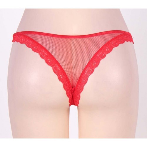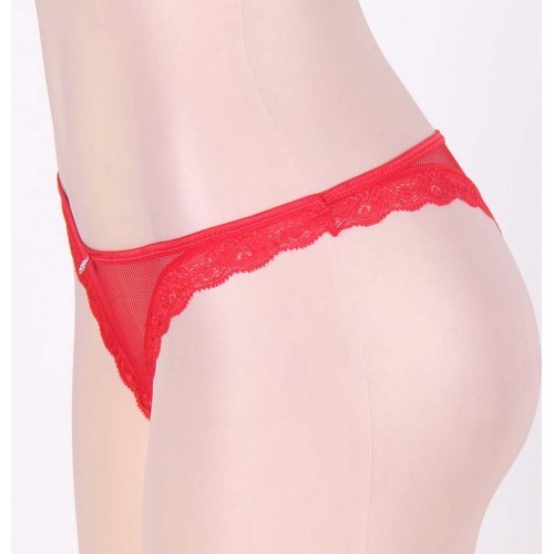 Red fishnet panty with romantic floral lace hem an unbelievably sexy addition to your lingerie collection. This cheeky thong will sit low on your hip.