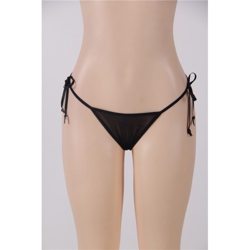 Wrap your beautiful bottom in this pretty black string. Complete your lingerie collection with this flirtatiously feminine G-string. Above your bottom, an embroidered flower design draws attention to your curves. The low -rise tiny waist band decorated with flirty bow with metal ring. The front of the sting is made out of soft, translucent mesh material.