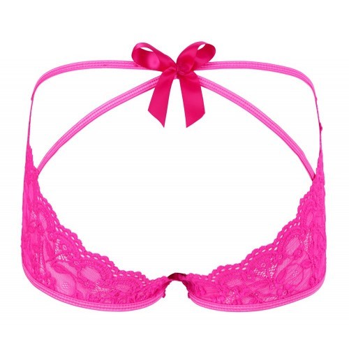 Charming pink floral lace panties with almost completely open bottom and big bow decoration. The front looks like a normal lace panties but the back is only 4 narrow straps that emphasise the bum in a really sexy way.