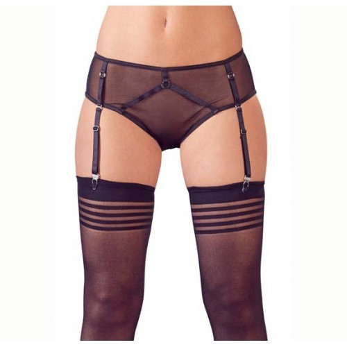 Sexy outfit for the basic bondage look. Transparent briefs with removable suspender straps. The fancy straps are decorated with silver colored rings. Set includes the matching stocking with striped upper part.