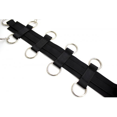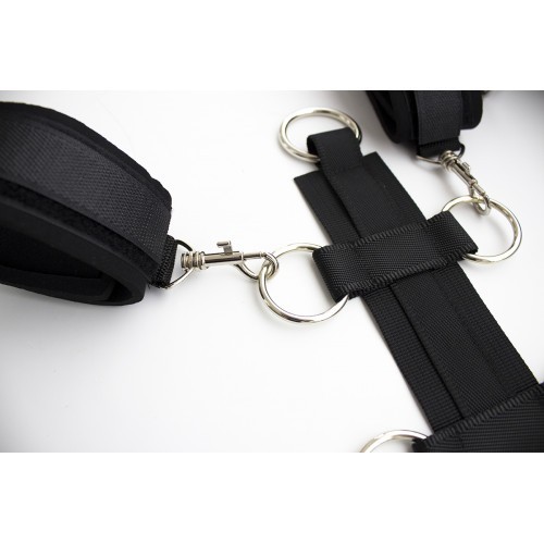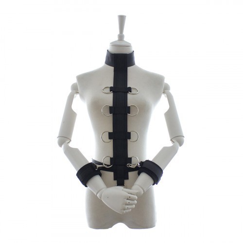Κολάρο με δακτυλιοειδή ιμάντα και χειροπέδες με άγκιστρα σε ένα σετ. Φτιαγμένο από μαύρο σατέν και μαύρη δαντέλα. Με όμορφο μαύρο βελούδο στο εσωτερικό. Ατομικά ρυθμιζόμενοι δακτύλιοι και άγκιστρα. Υλικό: 100% πολυεστέρας