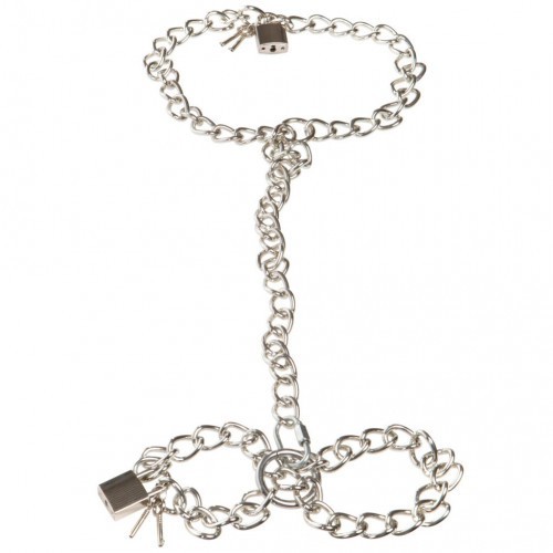 Δεμένη στις αλυσίδες για να νιώσει! Τρία σε ένα - Βαριά μεταλλική αλυσίδα, κολάρο, λουρί και χειροπέδες.
