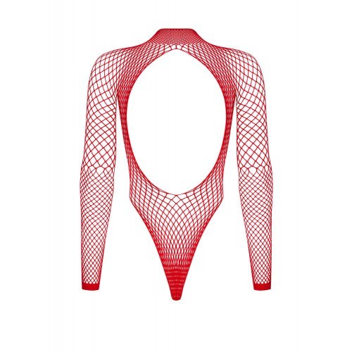 Τολμηρό κόκκινο δικτυωτό κορμάκι με άνοιγμα στην πλάτη και μανίκια. Ψηλόμεσο κόψιμο τύπου μπικίνι για τόνωση των καμπύλων σας.