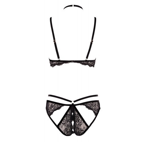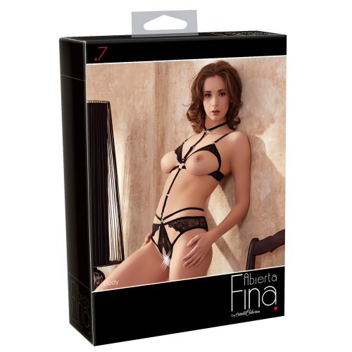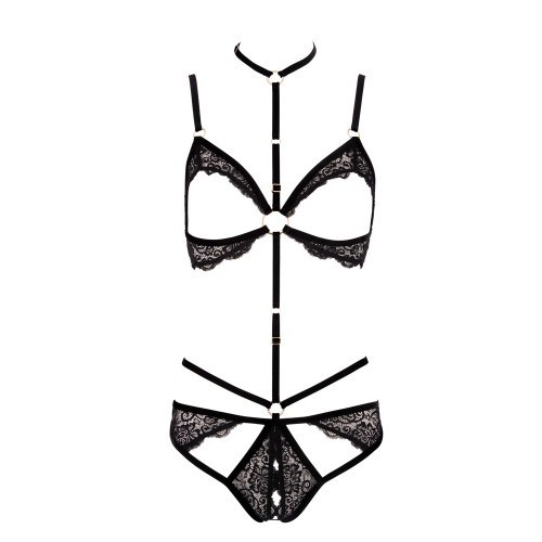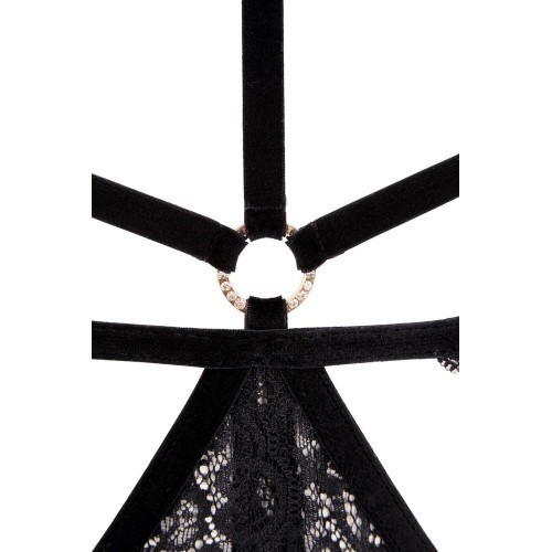Extremely revealing black body from velvet straps that frame your curves in a very elegant way. The straps can be adjusted so that the body fits perfectly and is comfortable to wear. The delicate lace from the open cups decorates your beautiful breasts and the crotchless briefs also have lace inserts as well. The numerous gold-coloured details like the ring (with decorative rhinestones) on the choker and the briefs add that little extra decoration to the body.
