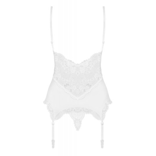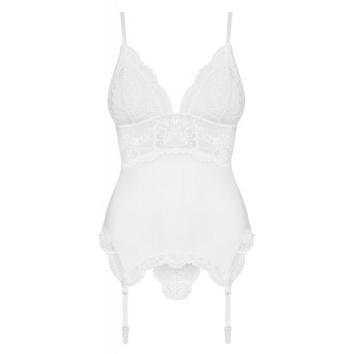Tempting white basque with seductive lace inserts and adjustable bra and suspender straps. A matching string is included.
