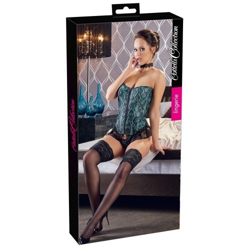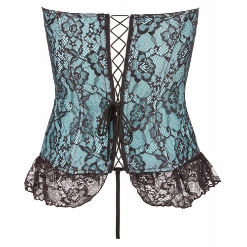 Beautiful fresh mint colored satin basque with matching string a must-have piece for your wardrobe! The green corset is covered with delicate floral lace and has ruffled lace around the bottom. The corsage top has integrated bones and hook fastener at the front which can increase anticipation when your partner is unhooking the corsage. At the back with lacing that will give you a sexy silhouette but it is not suitable for waist reduction.