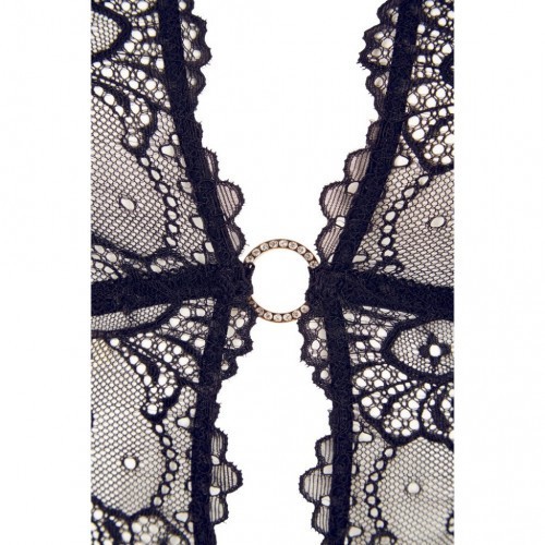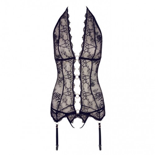 Black floral lace halterneck basque with open front. Four gold-coloured rhinestone rings hold the basque together in the front. The soft quality material is extremely comfortable to wear.