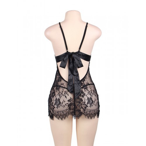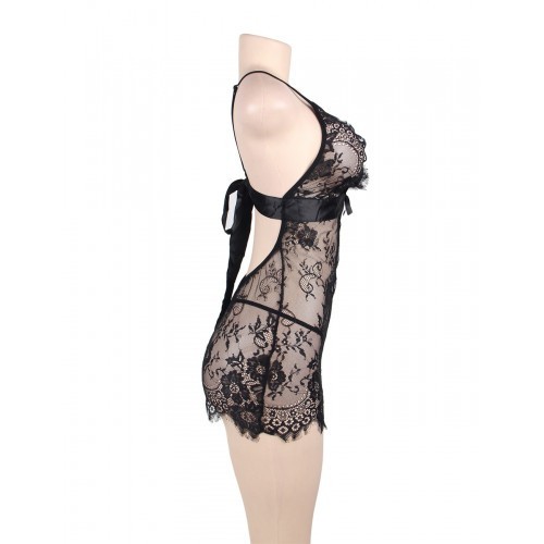 Translucent eyelash lace elegant chemise for hot bedroom moments. Black floral lace babydoll with matching string.