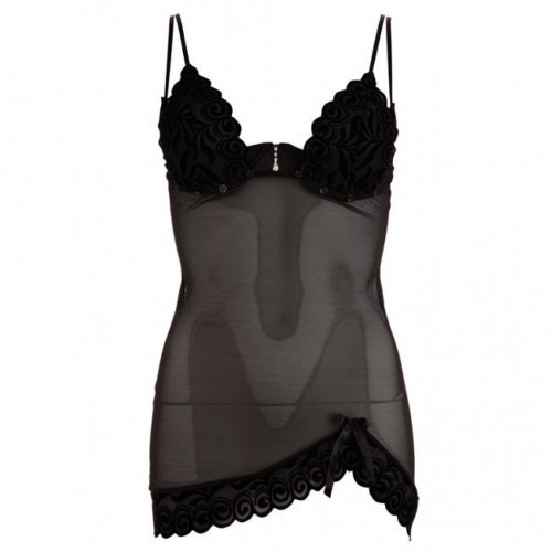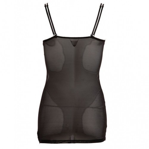 Black mesh mini dress with cups that can be unbuttoned with rhinestone decoration in the cleavage area and two pairs of straps. The straps both are adjustable and one pair can be removed with the cups.