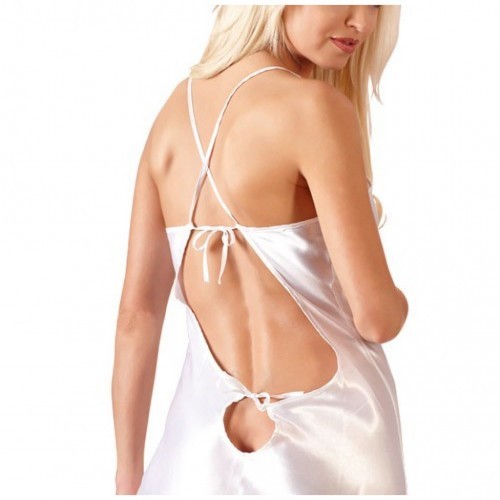 White satin chemise with a plunging back and individually adjustable straps for a perfect fitting.