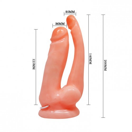 Διαθέτει λεία επιφάνεια και στά δύο ομοίωματα, τα οποία οταν εισχωρούν ταυτοχρονα μέσα στα επίμαχα σημεία, προσφερουν επιπρόσθετα ακόμη μεγαλύτερη διέγερση. Διαθέτει βεντούζα γιά άνετη χωρίς χέρια χρήση για εύκολη εφαρμογή σε ολες τις λείες και καθαρές επιφάνειες οπως τοίχους, πάτωμα, έπιπλα, στην ντουσιερα κλτ. Κατασκευασμένο απο τρίτης γενεάς Εύκαμπτο μαλακό PVC υλικό. Το Ντίλντο, με δύο ομοιώματα πέους, μπορεί να φορεθεί ακόμη και σε universal ζώνη στραπον η οποία πρεπει να διαθετει δακτυλίδια συγκράτησης του ομοίωματος στην ζώνη, από το σημείο της βεντούζας. Κατασκευασμένο με άοσμο, εύκαμπτο, μαλακό και πολυ φιλικό στον άνθρωπο, τρίτης γενεάς TPE, απαλλαγμένο απο φθαλικές ενώσεις, περίεργες μυρωδίες και χημικά. Φέρει όλες τις πιστοποιήσεις υγείας RoHs, CE.
