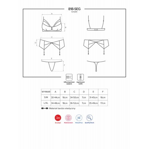 Σουτιέν από διάφανο σατινέ ύφασμα με διπλές λωρίδες - ανοίγματα επάνω από το μπούστο και κόσμημα με αστραφτερές πέτρες ενδιάμεσα των στήθων. Ρυθμιζόμενες τιράντες και 3 θέσεις κουμπώματος πίσω για άριστη εφαρμογή. Ζαρτιέρες με σατέν λωρίδες - ανοίγματα μπροστά και πίσω. Σατέν φιόγκος και λαμπερό κόσμημα στο λάστιχο της μέσης. Ρυθμιζόμενες τιράντες με Clips για σταθερή εφαρμογή. Οι κάλτσες δεν συμπεριλαμβάνονται.  Όλα τα εσώρουχα Obsessive είναι ιδανικά για δώρο σε ειδικό χάρτινο πολυτελές κουτί.