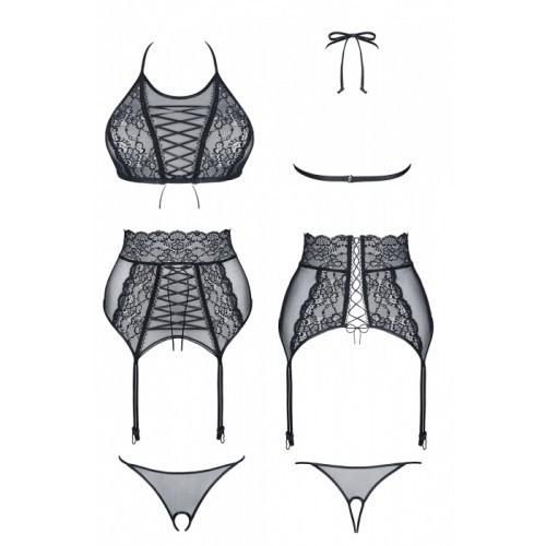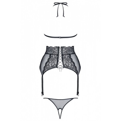 High-waist garter belt and the bra are an exciting combination of lace and mesh, adorned with black ribbon. Lacing along the entire length of the back adds a spectacularly sexy look, while helping to achieve perfect fit. Straps for attaching garters are made of black, shiny ribbon, which is elastic and eye-catching.
