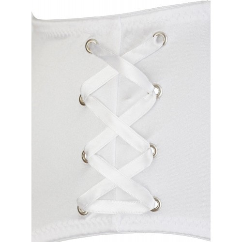 Sensual white satin/lace lingerie set for the first wedding night and the honeymoon or just a passionate evening with your loved one.Satin padded bra with lace insert and shiny rhinestone decoration with adjustable straps and hook fastener at the back. The shelf bra leaves your breasts exposed for maximum temptation. Matching floral lace string with open crotch area so you can continue your evening without interruption with the crotchless thong. Thanks to the suspender belt you can add your favourite stocking to your evening wear. satin suspender belt with lace insert and lacing on the sides and the front and 4 adjustable suspender belts.