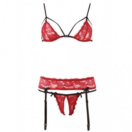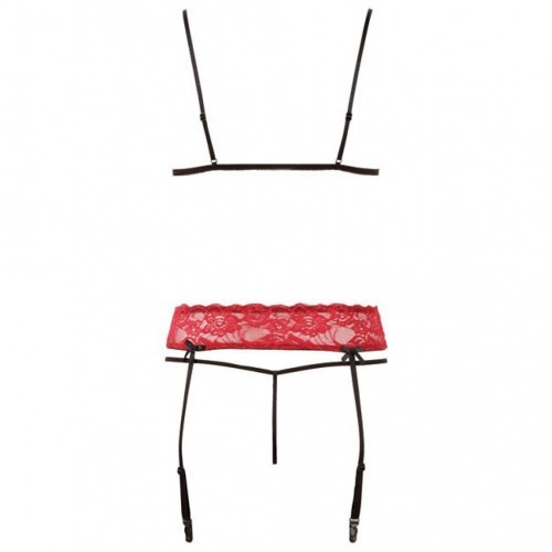 Wireless bra with cups that can be undone with buttons. Adjustable straps. Suspender belt with 4 adjustable suspender straps. Includes crotchless string.