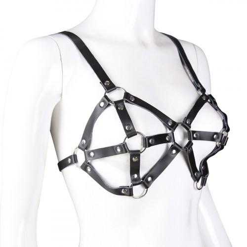 Unleash your erotic desires with a provocative leather bra. Imitation leather bra with metal ring connections for your BDSM play.