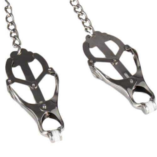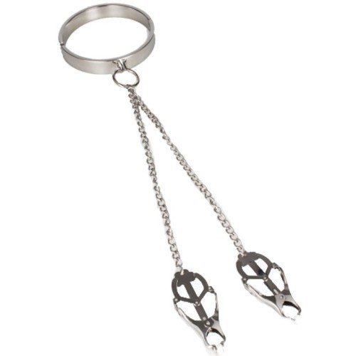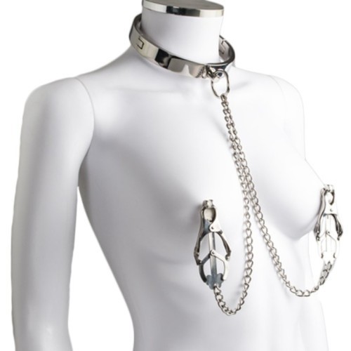 Βαρέου τύπου, μεταλλικό τσόκερ κολάρο λαιμού σε συνδυασμό με μεταλλικούς σφιγκτήρες θηλών τυπου clover για σοβαρά παιχνίδια bdsm απο την Naughty Toys. Το ερώτημα είναι - Ποιο είναι το αφεντικό εδώ; Κατασκευασμένο από κράμα βαρέως τύπου, αυτό το κολάρο λαιμού με σφιγκτήρες θηλών είναι ανθεκτικό και γυαλιστερό. Αφήστε το κορίτσι σας να αισθανθεί το βαρύ κολάρο και να την κάνει να συνειδητοποιήσει ότι είναι πραγματική φυλακισμένη τώρα. Μην είστε βαρετοί και απολαύστε αυτό το προιόν bdsm για να πραγματοποιήσετε τις φαντασιώσεις σας. Προσθέστε το κολάρο στα παιχνίδια της κρεβατοκάμαράς σας και να είστε σίγουροι ότι θα πάρετε τη σεξουαλική όρεξη του συντρόφου σας στα ύψη!