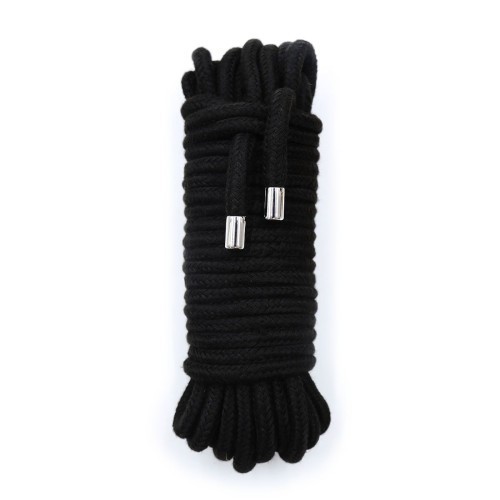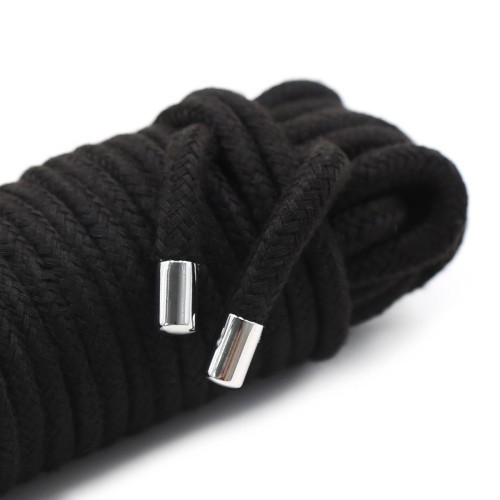 Βαμβακερό, φετιχιστικό μαύρο σχοινή, πέντε μέτρων, για μποντάζ δεσμά και δεσίματα bdsm παιχνίδια Naughty Toys. Υψηλής ποιότητας σχετικά χοντρό (Ø 0.7 cm) βαμβακερό μαύρο σχοινί για φετιχιστικά μποντάτζ παιχνίδια και Ιαπωνικά δεσμά και δεσίματα. Στιβαρό, μεγάλης αντοχής μπλέξη, σχοινί με το οποίο θα μπορείτε άνετα να δέσετε ολόκληρο το σώμα χωρίς να αφήνει σημάδια η ακόμη δερματικούς τραυματισμούς. Σε κάθε πλευρά υπάρχουν μεταλλικά κλιπσάκια τα οποία αποτρέπουν την πρόωρη φθορά.