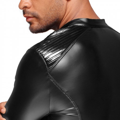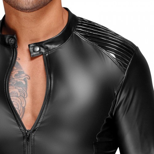 This sexy powerwetlook men's jacket rocks with epaulets made of pleated PVC. Black full-way zipper in the front and collar fastened with a clasp are variations on motorbike jacket.
