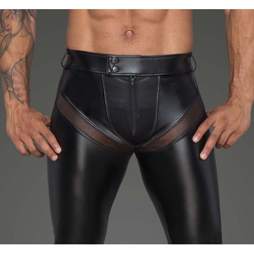 Reveal your power and your luxury style with this powerwetlook long pants from Noir Handmade. Shiny matte tight fitting trousers with translucent 3D net inserts on the hips that goes around on the legs. 3D net back pockets that will make your buttocks look more rounded. pants are fastened with zipper and two black snaps at the front.