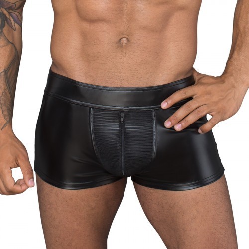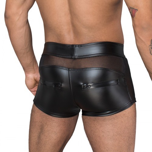Show off your sexy buttocks with this skin tight short from Noir Handmade. Classic powerwetlook short with translucent mesh insert at the back. Easy to open black zip at the front for fast access. The pouch area is covered with 3D net which makes your manhood look bigger.
