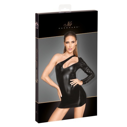 Look absolutly sensational in this fancy mini dress in your bedroom or in a party from Noir Handmade. Skin tight mini dress will show off your sexy feminine curves and make you look too good to resist. Asymmetrical powerwetlook dress with fancy neckline is extravagant choice for a night to remember. Lacquered eco leather strap across the chest and the crinkled sleeve make this dress even more luxurious. All eyes will be on you for sure...