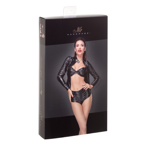 Remarkeable shiny matte jacket with plated sleeves that will attract all the attention on you. On both sleeves with handmade pleats that makes this outfit unique. Motorbike-style collar is fastened with a clasp. Also with comfortable 2-way zipper in the front and small zippers on forearms.