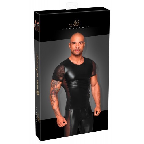 Tight-fitting matte look shirt with round neck, short sleeves made out of net and net inserts at either side. It is very comfortable to wear and can be combined in many ways.