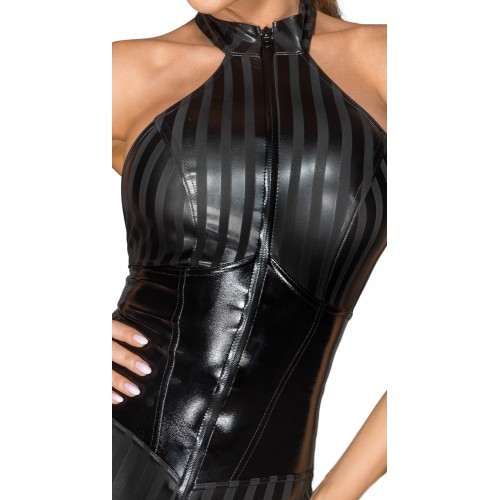 Figure-flattering halterneck mini dress with a collar, a low-cut back and a long 2-way zip at the front. Striped power wet look with a sewn-in waist cincher that is made out of imitation leather with a vinyl coating.
