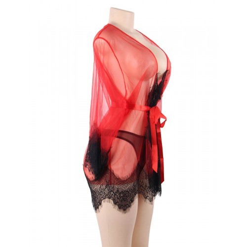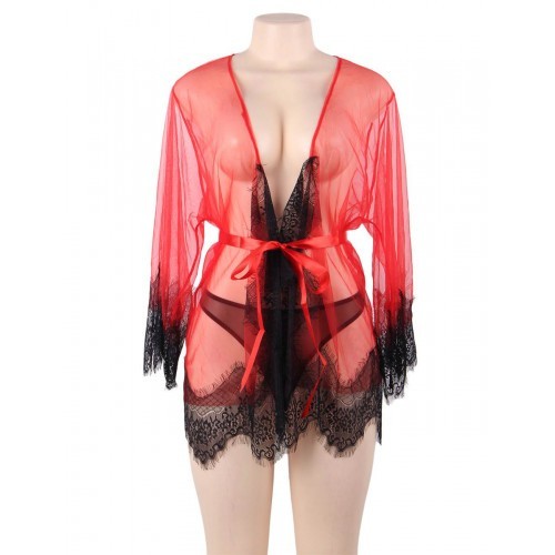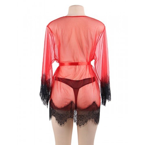 The must have piece in every lingerie wardrobe. Transparent kimono with delicate eyelash lace hem on the bottom and on the sleeves. The kimono includes a matching string as well to make your evening outfit complete.