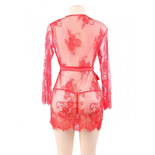 Luxurious red lacy rope with silky satin waist tie for your curves. Wrap yourself in this super light rope and make your lover heart beat rise. The delicate neckline will draw the attention of your lover to your cleavage. The translucent light kimono is coming with a matching sexy G-string to make your outfit complete.