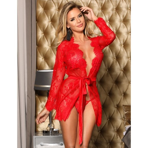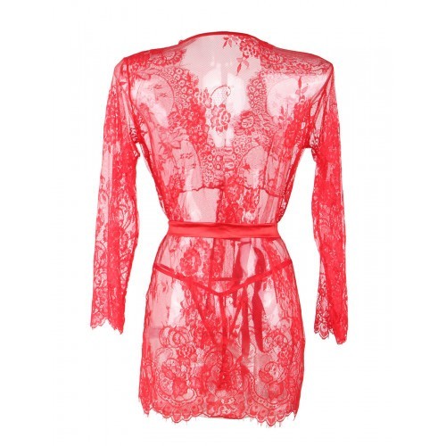 Luxurious red lacy rope with silky satin waist tie. Wrap yourself in this super light rope and make your lover heart beat rise. The delicate neckline will draw the attention of your lover to your cleavage. The translucent light kimono is coming with a matching sexy G-string.