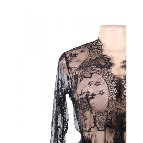 Luxurious black lacy rope with silky satin waist tie. The delicate neckline will draw the attention of your lover to your cleavage. The translucent light kimono is coming with a matching sexy G-string.